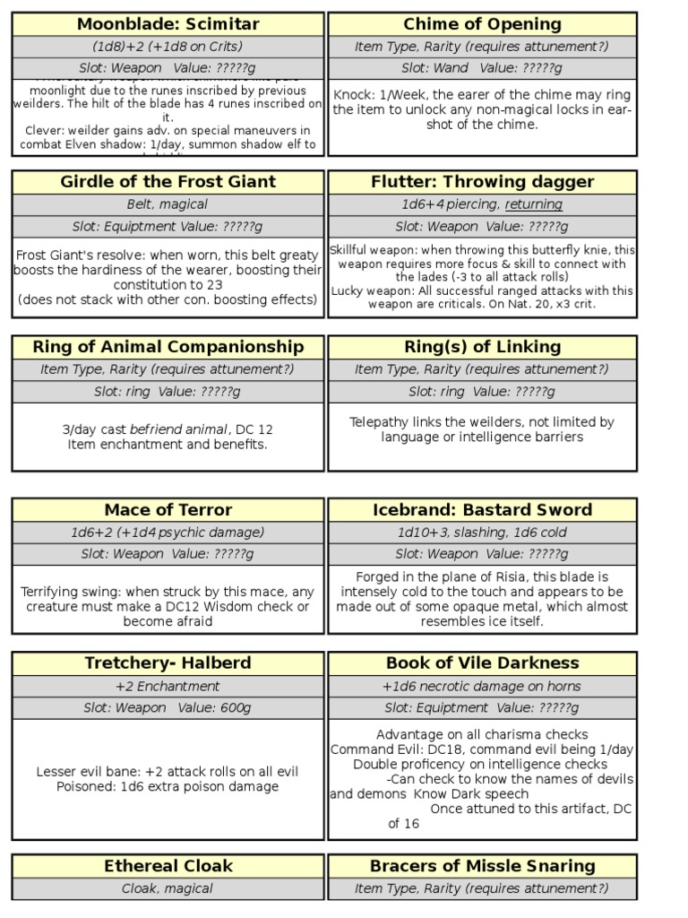 I made over 300 of these bad boys to better help new players understand equipment or simply to add a more organized way of playing. Dungeons and dragons dd fifth edition 5e magic items. I like magic set editor with tintagels dd 5e templates.