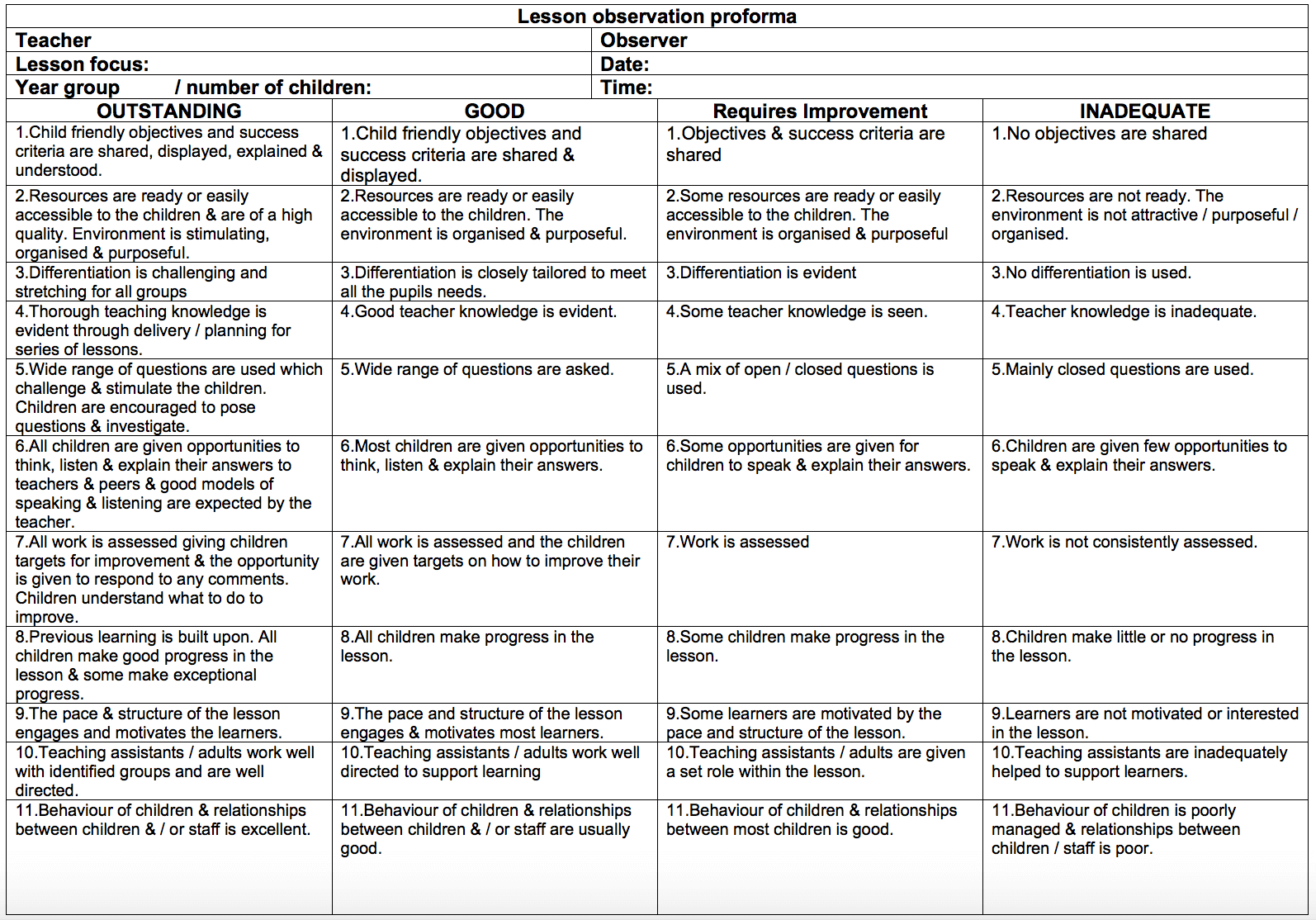 Observation Template Teacher Training Pgce Ta Teaching