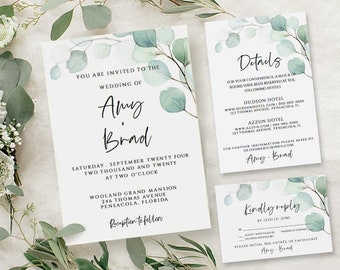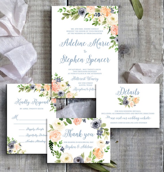 Printable Wedding Invitation Template Wedding Invitation Printable Peach Wedding Invitation Dusty Blue Greenery Wedding Invitation Set