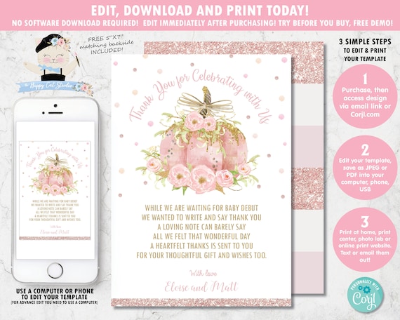 Pink Pumpkin Baby Shower Thank You Note Card Pumpkin Printable Sweet Little Pumpkin Baby Girl Shower Floral Chic Editable Template Lp2