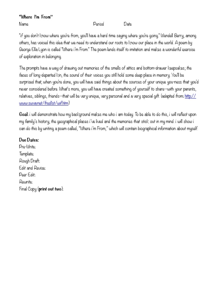 Where im from poem you can use the template provided to you to help get your poem started. Our platform will provide you with a wide collection of templates that are offered for filling in on the internet. I am from location of family pictures mementos archives and several more lines indicating their worth.