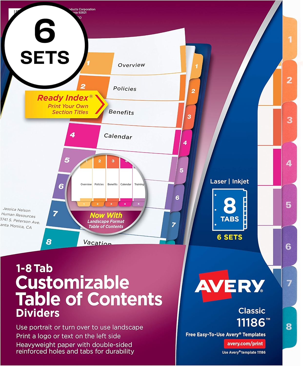 Avery 8 Tab Dividers For 3 Ring Binders Customizable Table Of Contents Multicolor Tabs 6 Sets 11186