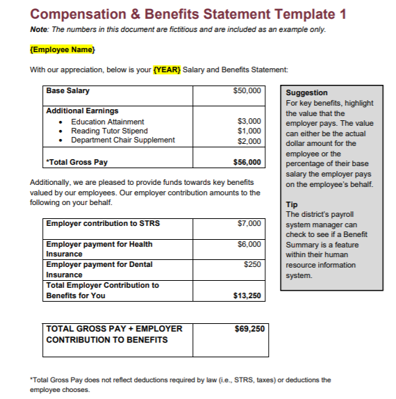 Even though these statements include as many as 60 different perks and benefits they can usually be created in just 5 7 minutes. Total compensation statement for sample employee june 2010 dear sample employee this compensation statement is a brief overview of the benefits provided by your employer. Below is a total compensation statement template you can use to build your own forms.