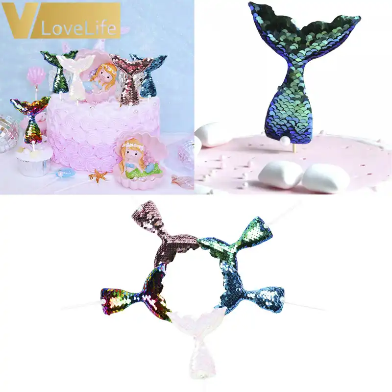 Multicolor Sequins Cake Cupcake Topper Mermaid Tail Pattern Happy Birthday Decoration For Wedding Theme Party Decor Supplies