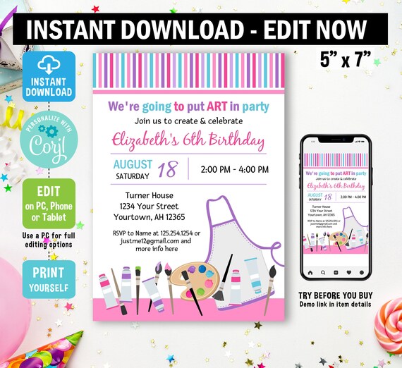 Painting Birthday Invitation Edit In Corjl Painting Party Art Invitation Crafts Girl Invitation Printable Instant Download Template