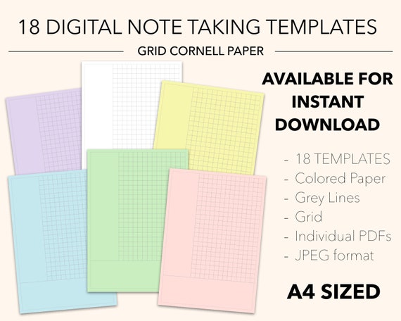 18 Digital Note Taking Templates Grid Cornell Paper Grey Lines White Yellow Blue Green Pink Purple Pdf Jpeg
