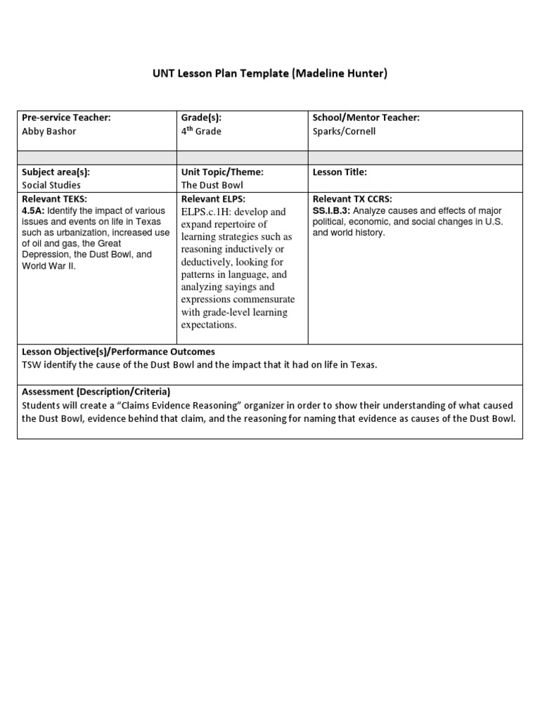 Madeline Hunter Lesson Plan Template Addictionary