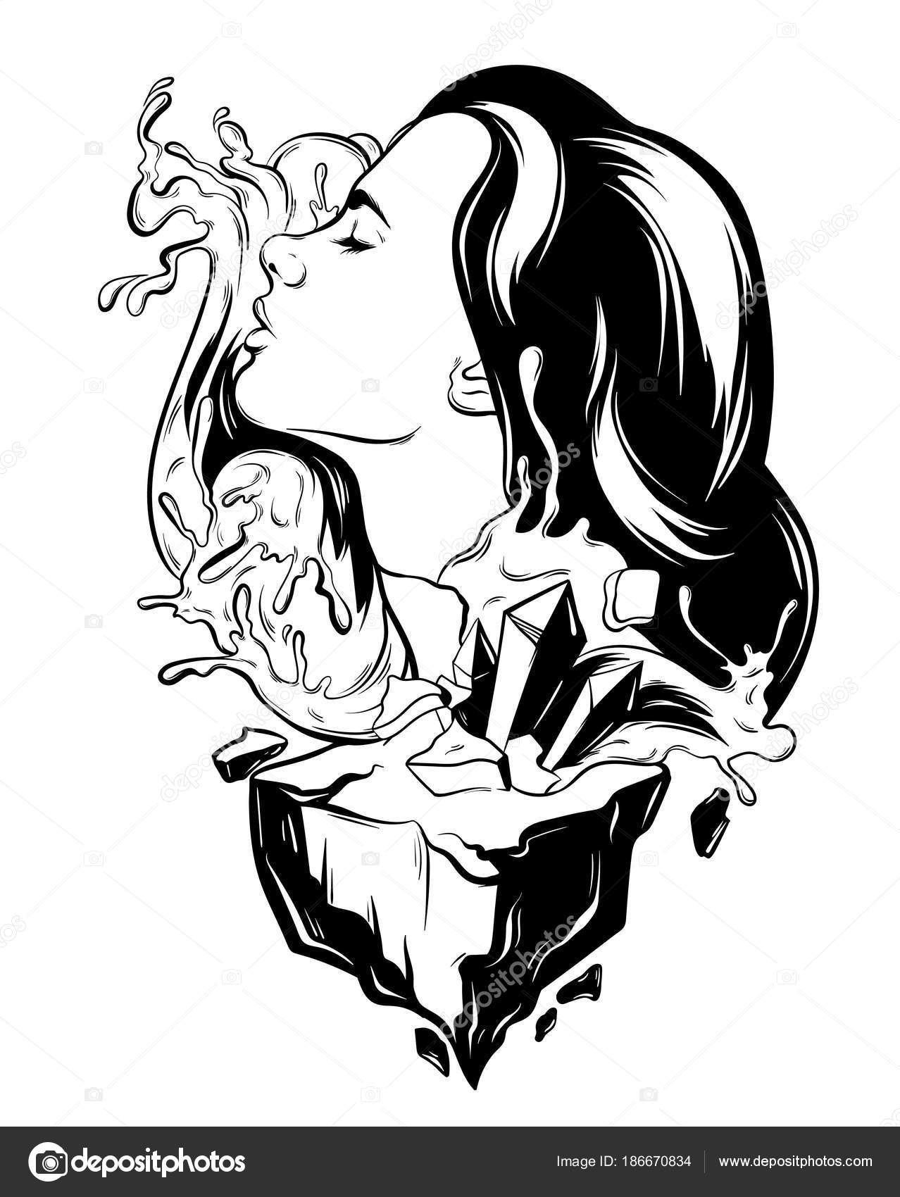 Vector Hand Drawn Illustration Of Pretty Woman With Waves And Rock Creative Tattoo Artwork Template For Card Poster Banner Print For T Shirt