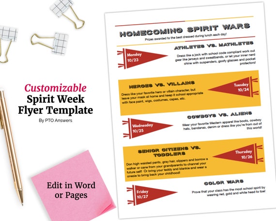 Homecoming Spirit Wars And Spirit Week Fully Editable And Customizable Flyer Word Pages Template For Pta Pto Diy Template