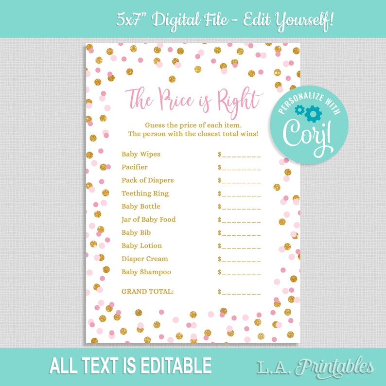 Editable The Price Is Right Baby Shower Game Template Pink Amp Gold Glitter Confetti Shower Game Edit Yourself Corjl