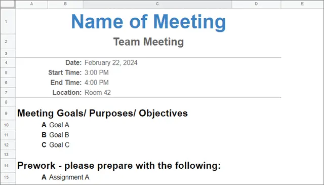 Make a copy of this this google docs sheet template and personalize it as per your requirement. Collaboratear your group name here agenda date time from 100 to 230 dont forget to include the end time location roll callattendance roll call will be taken via the sign in sheet passed around the room at the start of the meeting.
