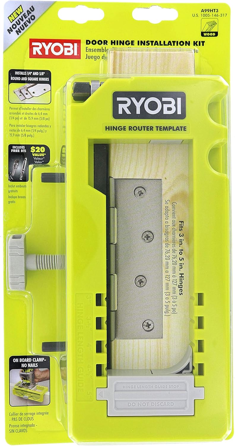 This kit perfect for home improvement projects attaches snugly to standard sized doors with its built in plastic clamp eliminating rocking or other movements while you rout that perfect square or rounded hinge mortise. Ryobi a99ht3 door hinge installation kitmortiser template no need for any screws or nails thanks to the integrated non marring clamp that will let this tool fit standard door thicknesses cut for rounded or squared hinges thanks to the removable plastic insert.