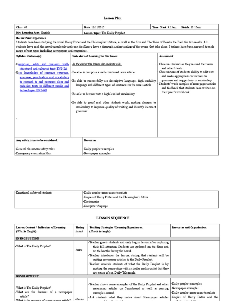 Lesson Plan The Daily Prophet Newspapers Teachers