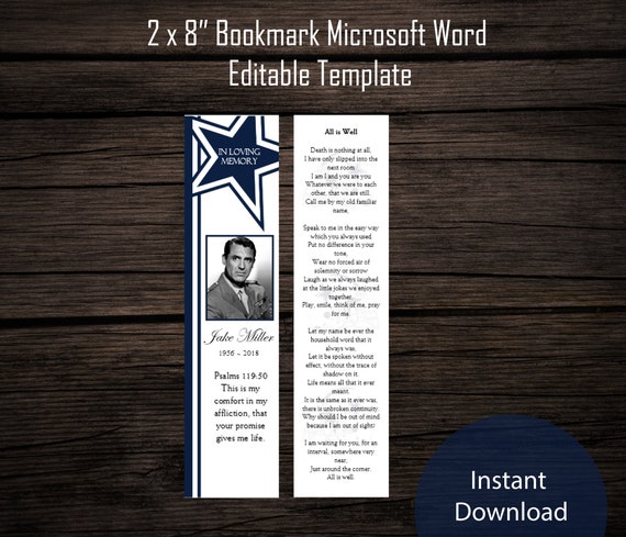 Funeral Bookmark Template Dallas Cowboys Memorial Bookmark Program Printable Microsoft Word Keepsake