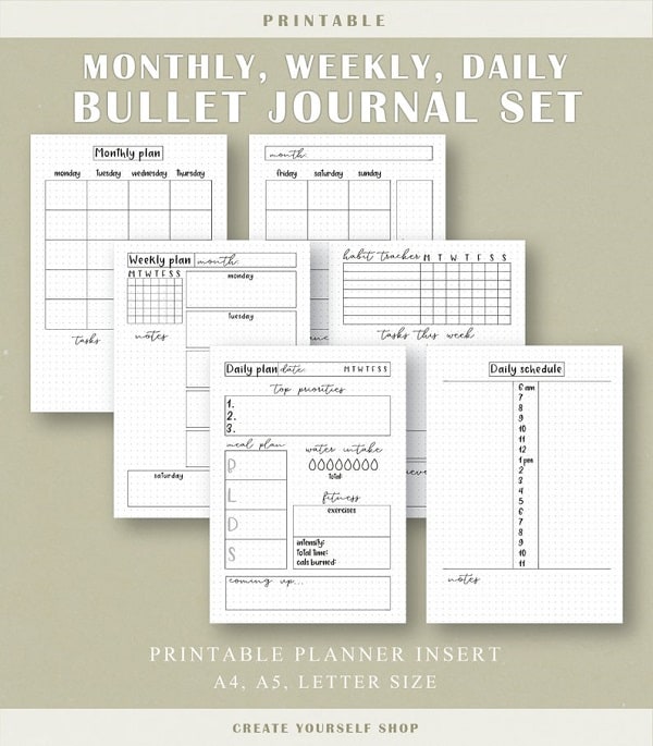 Add to your journal pages. You can either create each bullet journal template or use our premade bullet journal printables. Templates keep your bullet journal clean and in order whatever that looks like for you and will keep you from looking at your planner and feel like you are staring at hieroglyphics.