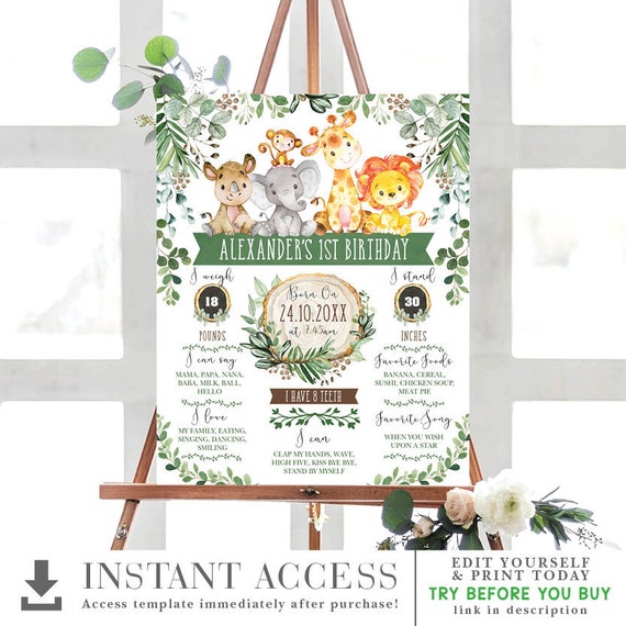 Rustic Jungle 1st Birthday Milestone Poster Greenery Safari