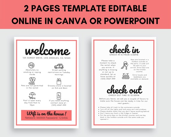Airbnb Quick 2 Pages Welcome Guide Editable Canva Template Powerpoint Keynote Airbnb Host Guide Welcome Book Guide Rental Guest Book