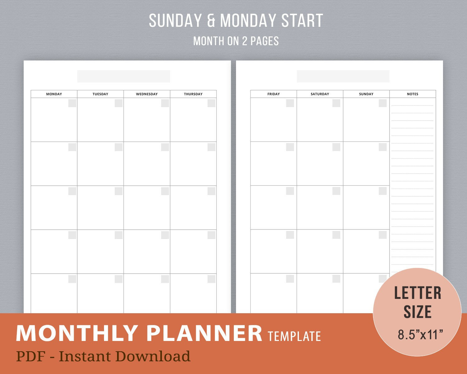 2019 Monthly Planner Printable Undated Planner Inserts Letter Size Month On Two Pages Mo2p Monthly Agenda Goals Pdf Instant Download