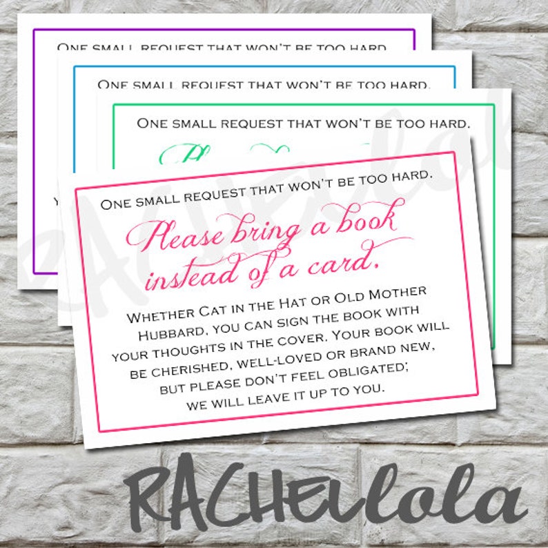 Whether cat in the hat or winnie the pooh you can sign the book with a note from you. Easily personalize the book request cards with your own words make multiple versions and print as many times as you need. If youre hosting a bring a book baby shower a poem could be a creative way to include in the invitations.